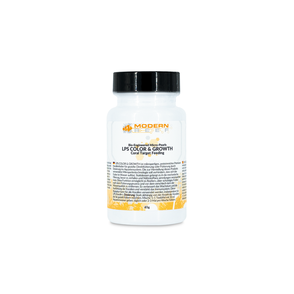 LPS COLOR & GROWTH is micro-pearl, high-protein coral food for target direct or broadcast feeding. The micro-pearl technology used to create this product is designed to prevent the food from diluting into the water. Instead, it travels into the mechanical filtration before it can break down and cause nutrient accumulations. This feature allows reefers to remove excess foods after the feeding process, before declining water quality. It improves the growth and coloration of corals and promotes a better immune system. This formula can be used for all corals, particularly for LPS corals.